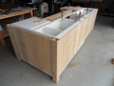 Kookeiland in productie rustiek eiken Kookeiland met granieten werkblad en inbouwapparatuur aluminium